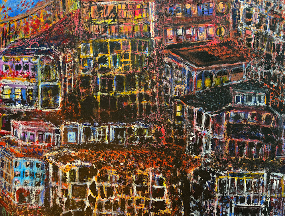 This interplay between light and dark mirrors the layers of urban life: the seen and unseen, the bustling energy and the quiet intimacy. "A Night Like This" is not just a painting—it’s an immersive experience, inviting viewers to explore the magic hidden within every moment, both in the glow of connection and in the quiet mystery of the dark.