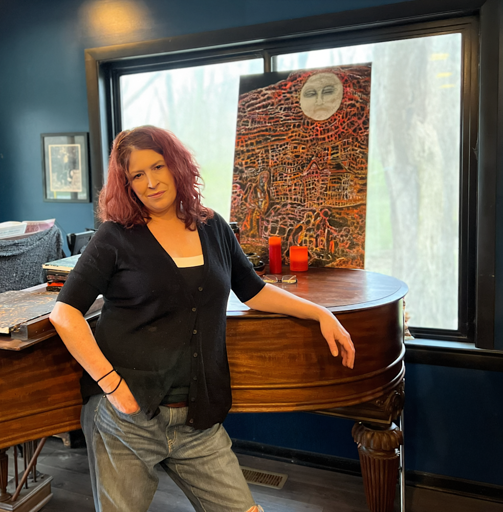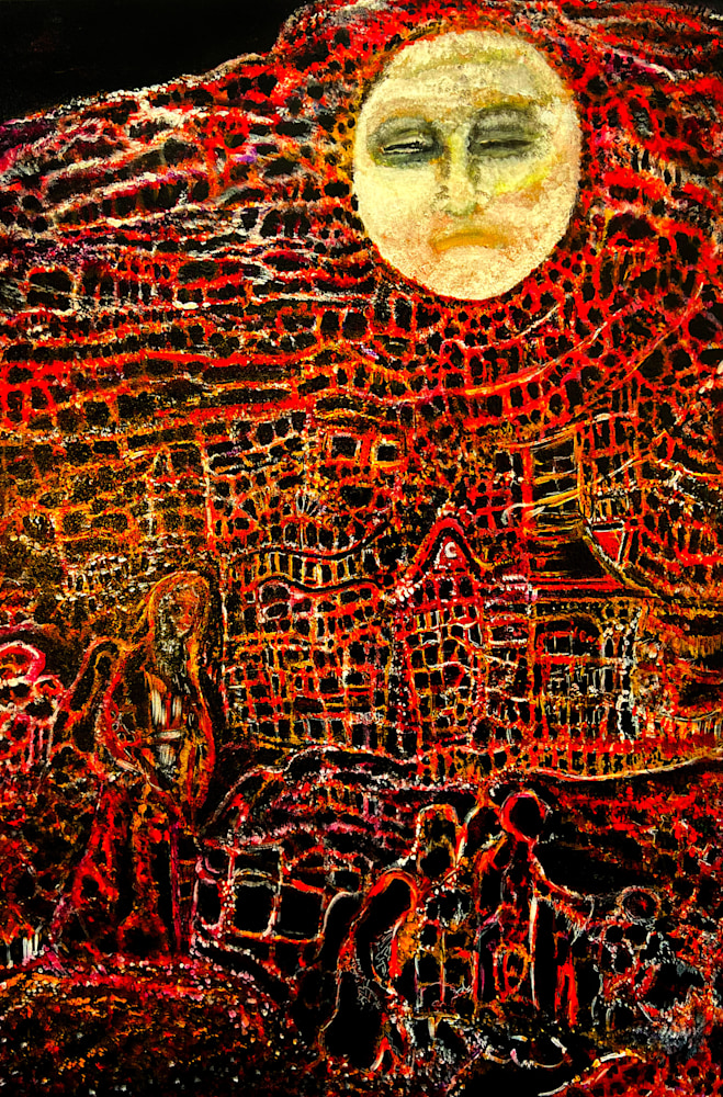 Father Luna is the largest painting I have ever completed, created on a canvas gifted to me by my father. That history gives the work a quiet gravity. His face — my face — emerges in the glow of the blood moon, framed by long, wavy red hair that blends into its fire. This was the first time I allowed realism into my practice, letting my own likeness become a source of illumination.