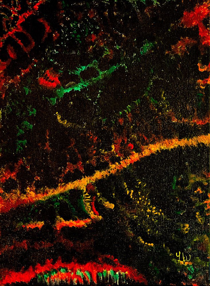 Created through instinct and immediacy, the work mirrors the sensation it carries. Each stroke responds to the subtle surge beneath the surface — a movement felt more than seen. Layered acrylic and impulsive bursts of color echo the molecular shift of energy leaving form, scattering vibrancy into new realms.
