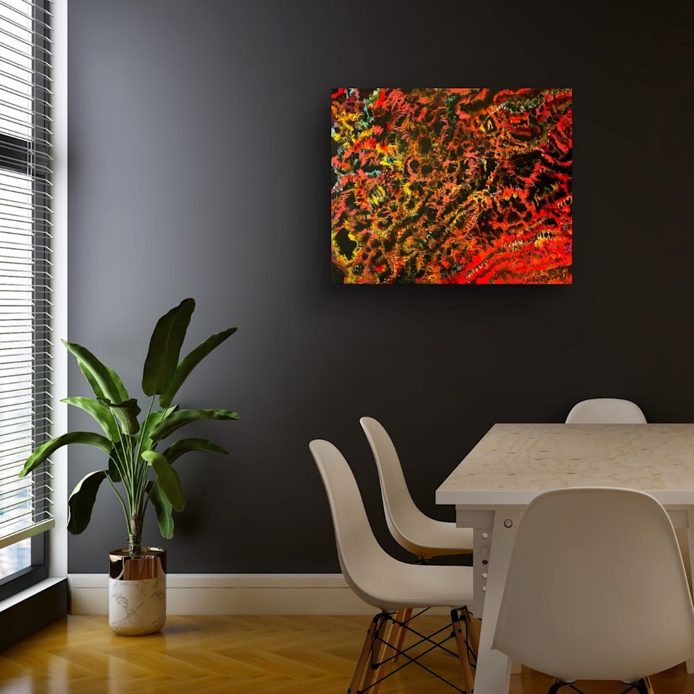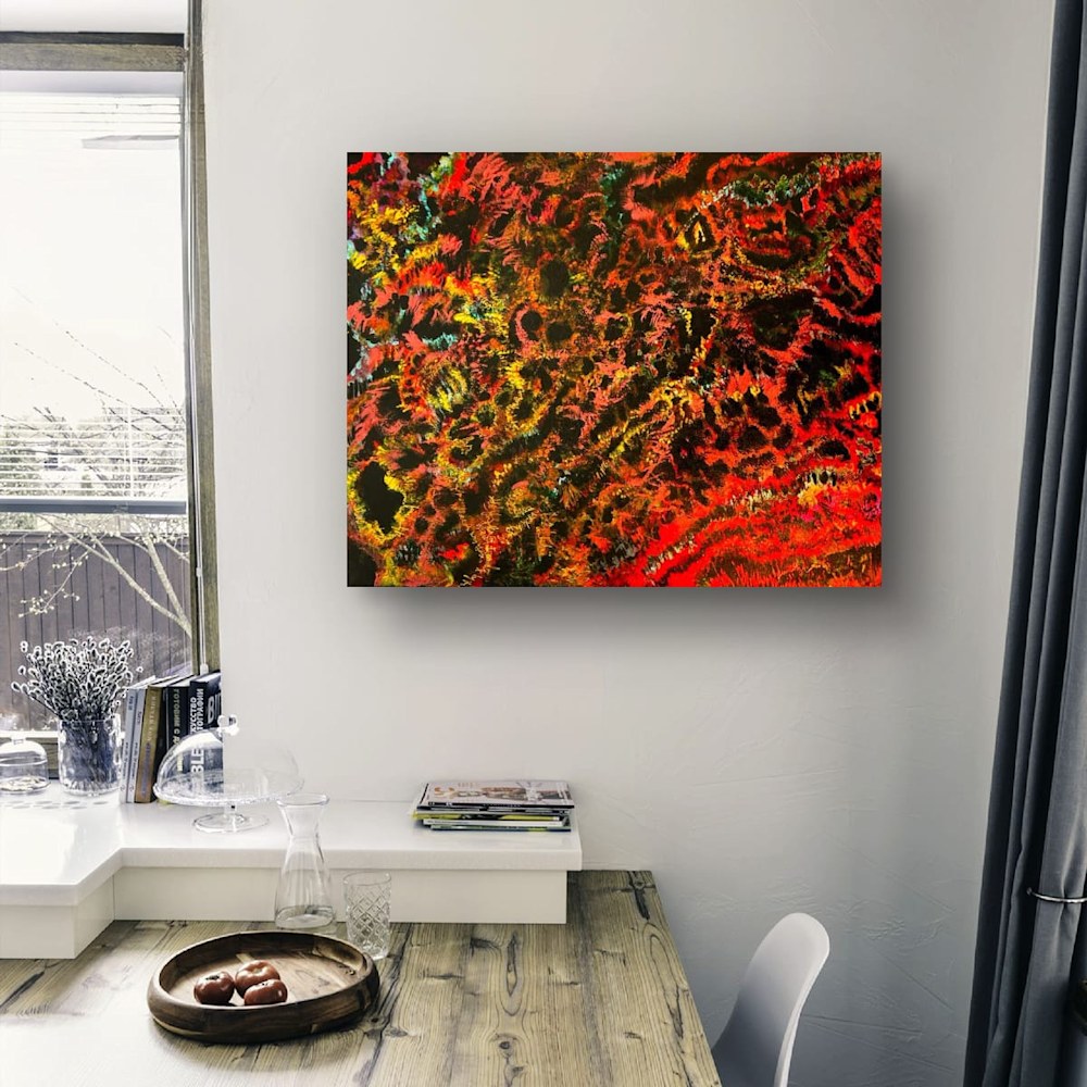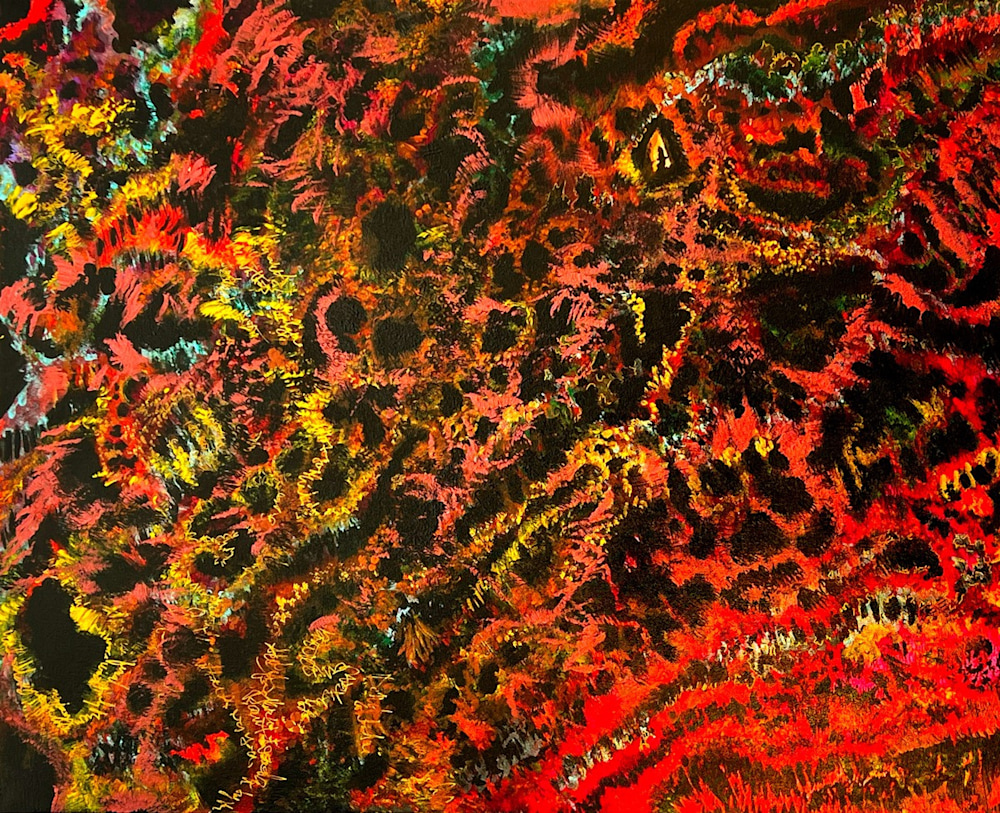 Beyond the narrow passage lies a vortex of color and sensation: incandescent reds, molten oranges, and streaks of black tear through the canvas, threaded with whispering blues and defiant greens. It churns like memory — fluid, chaotic, uncontainable. At first glance, it reads as abstraction. But lean in, and something ancient stirs. These forms are familiar. These hues once gripped me with dread.