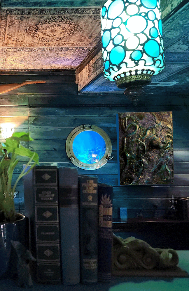The palette of deep blues, greens, and earthy tones reflects the psychological terrain of regret, reckoning, and renewal. Beneath the surface, flora meets fauna — vines twist with tentacles, roots entwine with scales. Plants bloom in shadow, nourished by stillness and surrender. This hidden ecosystem speaks to the way life continues even in submerged places — quietly, instinctively, insistently.