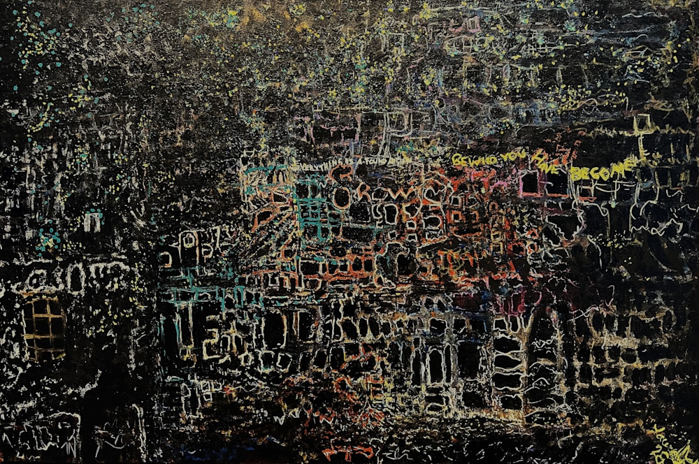 The embedded phrase “Everything is a foundation” sits at the heart of this work. I believe that every experience, every season of intensity, every moment of pressure becomes part of our architecture. Nothing is wasted. The painting’s dense, city‑like lattice reflects that idea — a visual map of how identity forms through accumulation, collapse, rebuilding, and emergence.