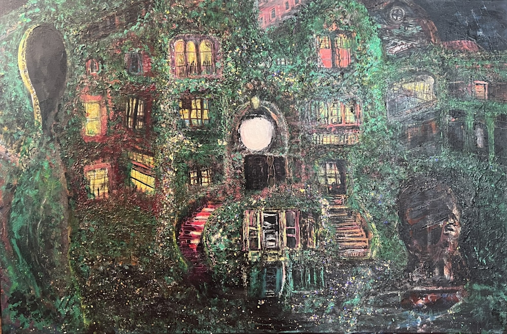 Three figures appear within the composition, each connected to the story the building carried — threads of lineage, memory, and the assumptions placed upon the artist as a child. Growing up genetically linked to her grandmother’s illness, she was treated as though her future had already been written, moved through weekly counseling and quietly expected to follow the same path toward institutionalization. Greenlawn Vacancy confronts that legacy directly. Through luminous color, shifting forms, and the building’s eerie glow, the painting becomes a reclamation of identity and autonomy. It asserts a truth learned through lived experience: we are not our genes, not our diagnoses, and not the fears projected onto us.