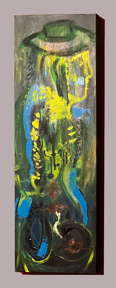 Description: One to Admire is a luminous tribute to dignity, style, and unapologetic presence. Painted in acrylic and blacklight-reactive pigments, the tall canvas features a man in a wheelchair—dressed to the nines, radiant with self-assurance, and unmistakably out on the town. His wide-brimmed hat casts a confident silhouette, while neon accents trace the contours of his face and form, glowing softly in darkness like a quiet celebration.