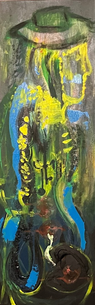 One to Admire was created in the wake of a complicated loss—the kind that begins long before a final breath. Painted in acrylic and blacklight‑reactive pigments, the tall canvas centers a man in a wheelchair, dressed with intention and radiant with self‑assurance. His wide‑brimmed hat casts a confident silhouette, while neon accents trace the contours of his face and form, glowing softly in darkness like a quiet celebration. He is not waiting to be seen; he is already shining.