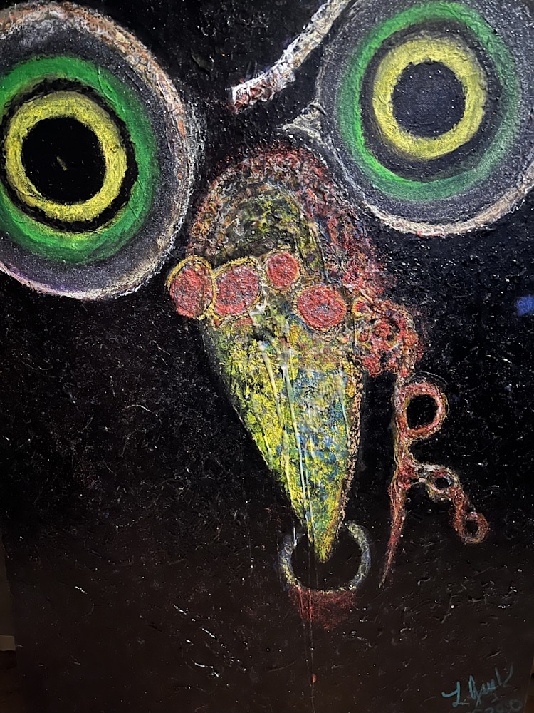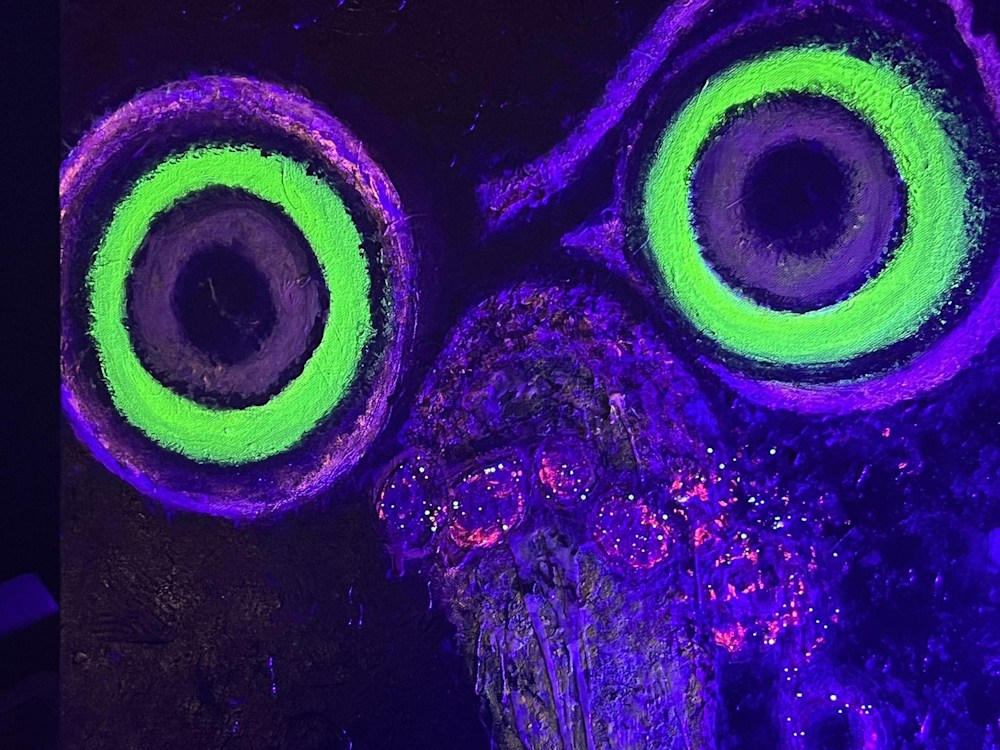 In natural light, the painting reveals its subtle sculptural textures and layered strokes. Under blacklight, the eyes glow in vivid concentric rings, revealing a hidden dimension within the piece. Sealed in multiple layers for durability and depth, Purpose is a work about transformation, resilience, and deciding for yourself when something is complete.