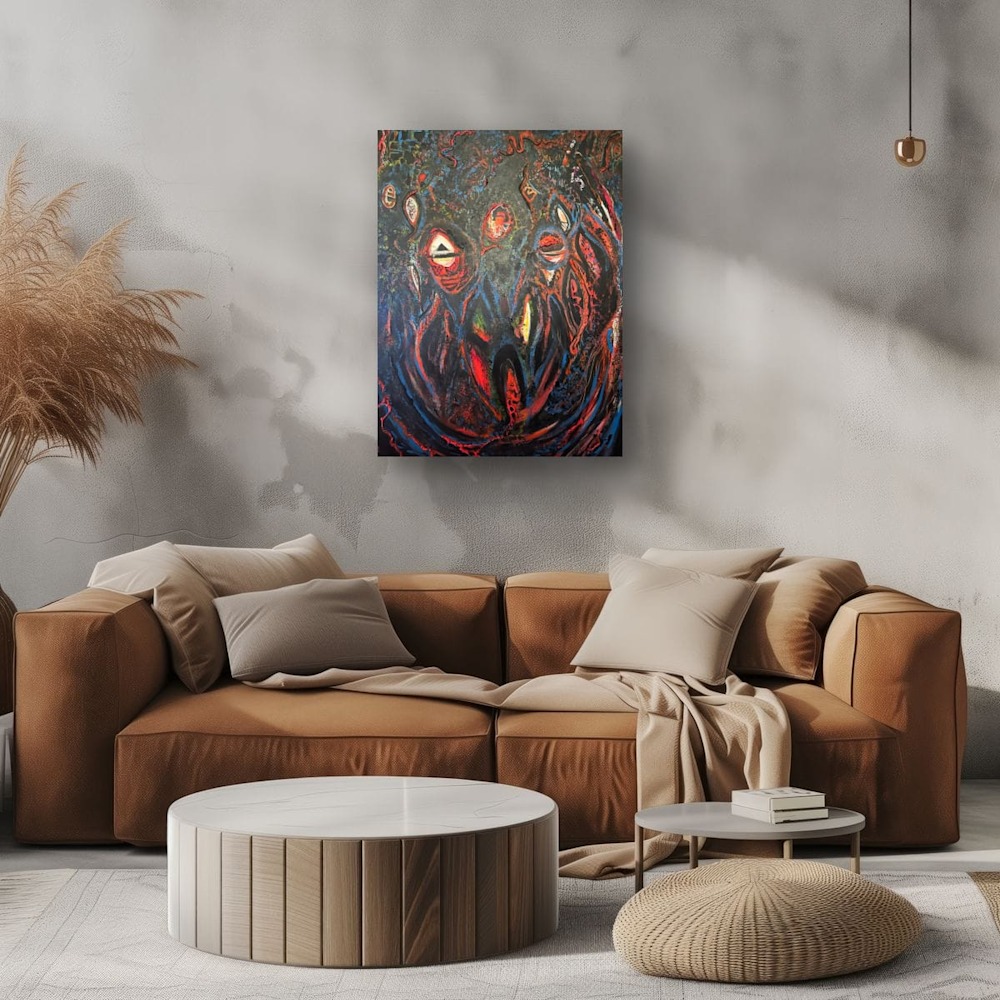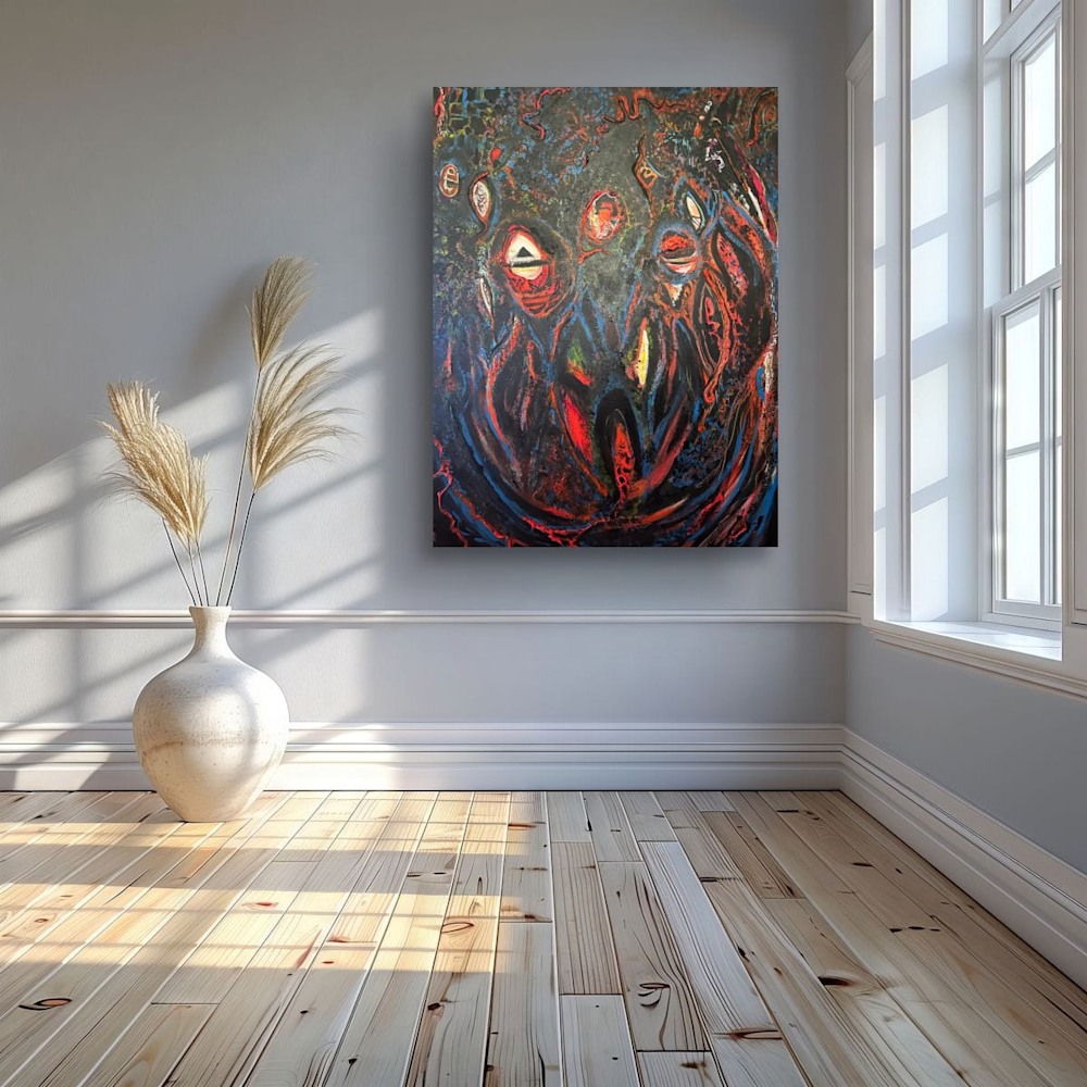 Swirling reds, blues, and oranges pulse against a blackened void, forming a mask-like figure that feels both ancient and elemental. Under blacklight, hidden layers ignite, revealing spectral truths embedded in its textured surface. 3D accents heighten the sense of presence, inviting viewers to step into the cave—not as tourists, but as witnesses.