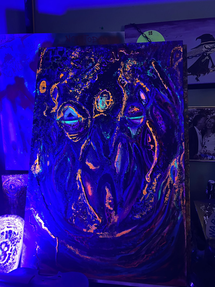24 x 36 | Acrylic, mixed media | Blacklight-reactive & 3D accents | Completed April 2025